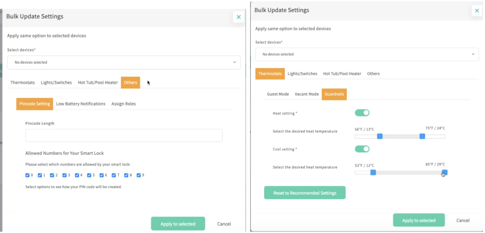 You can either create custom pin code settings, or default to automatic pin codes created from each guest’s phone number. Additionally, you can either bulk update properties and devices or manually build out your settings which include guardrail settings to customize your temperature, lights, and heaters within your properties.