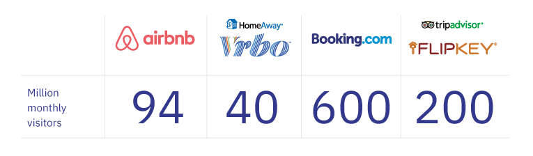 The list above is a starting point for vacation rental owners but these companies command the most significant market share in the industry. On top of that, Airbnb and Vrbo & HomeAway make it easy to set up a listing. So if you’re starting, they’re a must for listing a property. Also note that on Booking.com and TripAdvisor, you’ll be competing with regular hotels. Airbnb, Vrbo, HomeAway, and FlipKey are exclusive to vacation rentals.