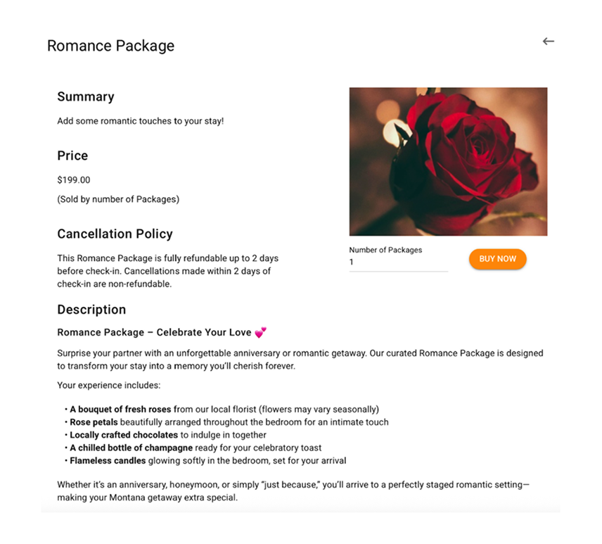 Pintler Cabins has also discovered new revenue opportunities through Hostfully’s Digital Guidebooks. The Marketplace feature allows them to offer upsells like early check-ins and checkouts: extra income for minimal (if any) work. When Jamie’s last-minute decision to offer a “Romance Package” in the company’s guidebooks was purchased by a guest, Jamie and team needed to hustle to make it happen. Now, what seemed like a random experiment has become a burgeoning hospitality opportunity.
