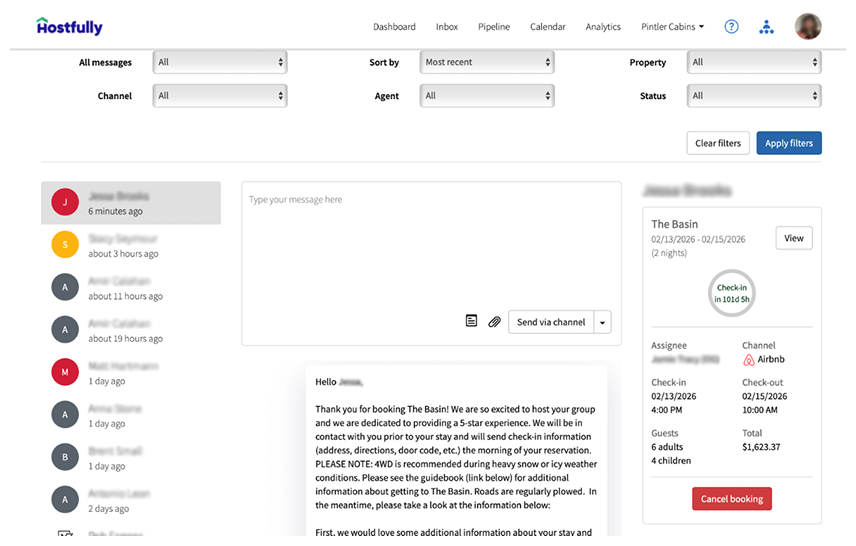 While Jamie is quick to cite Hostfully’s color-coded pipeline view and analytics dashboard, among other features, it’s the PMS’s Unified Inbox and communications capabilities that quickly became the cornerstone of Pintler Cabins’ operations. Simply put, “I didn’t want to have to communicate with guests on multiple different platforms.”