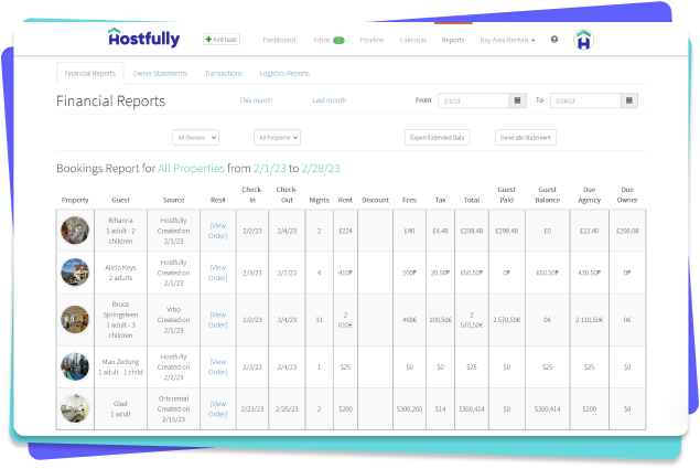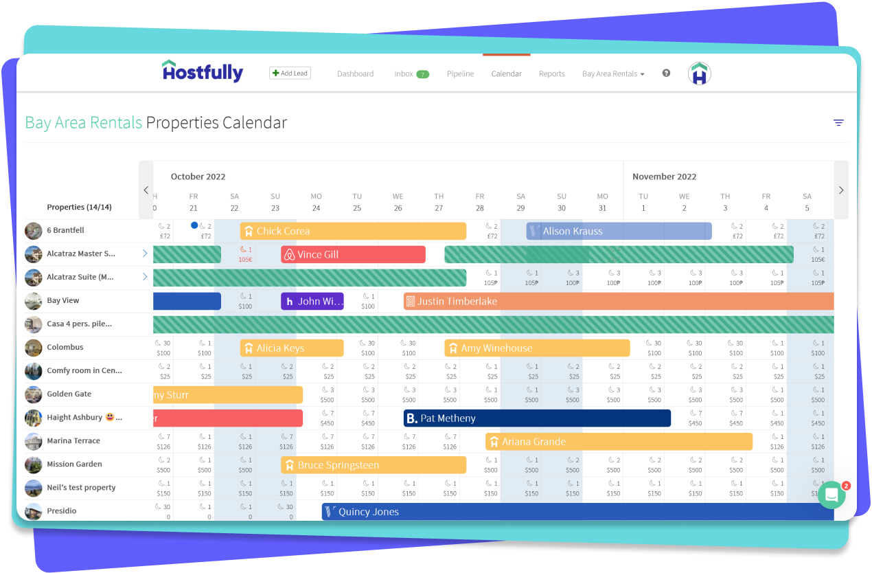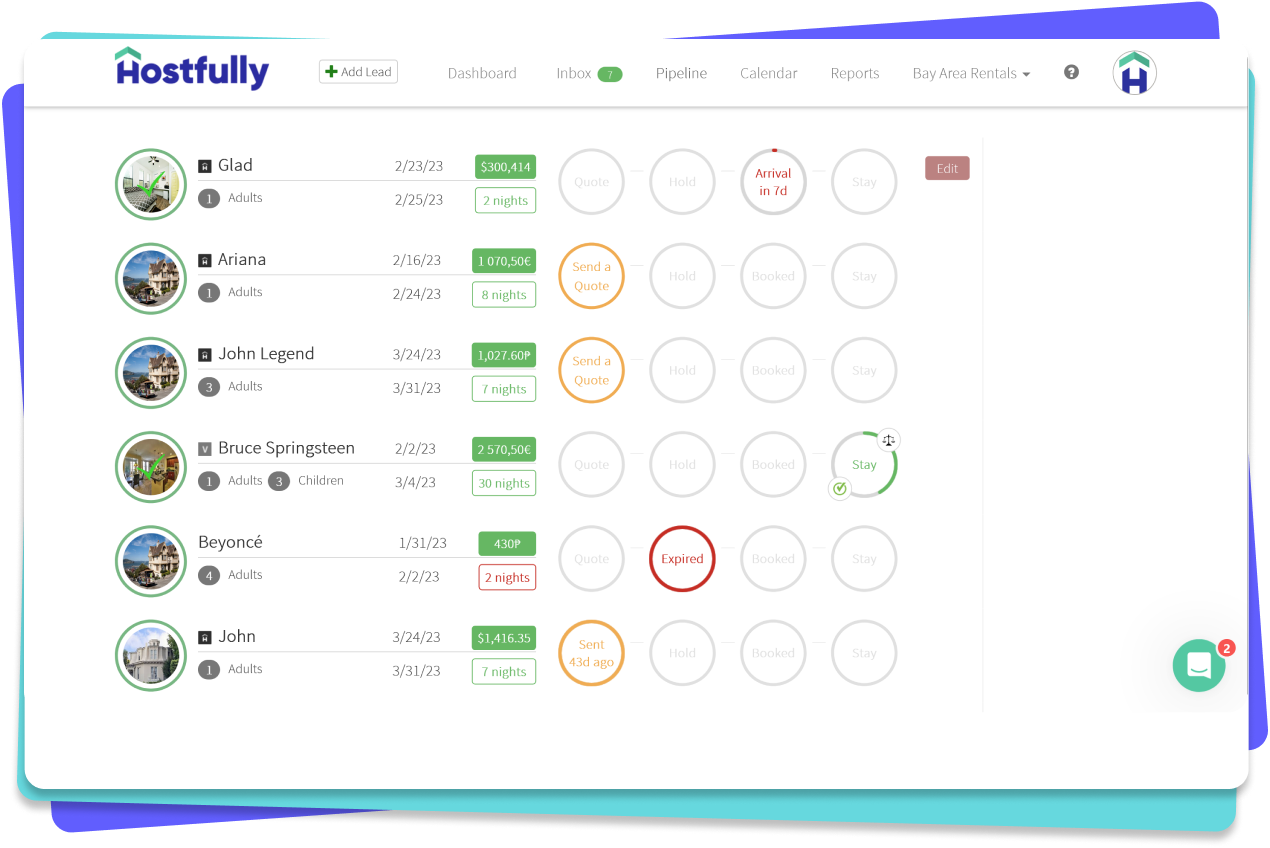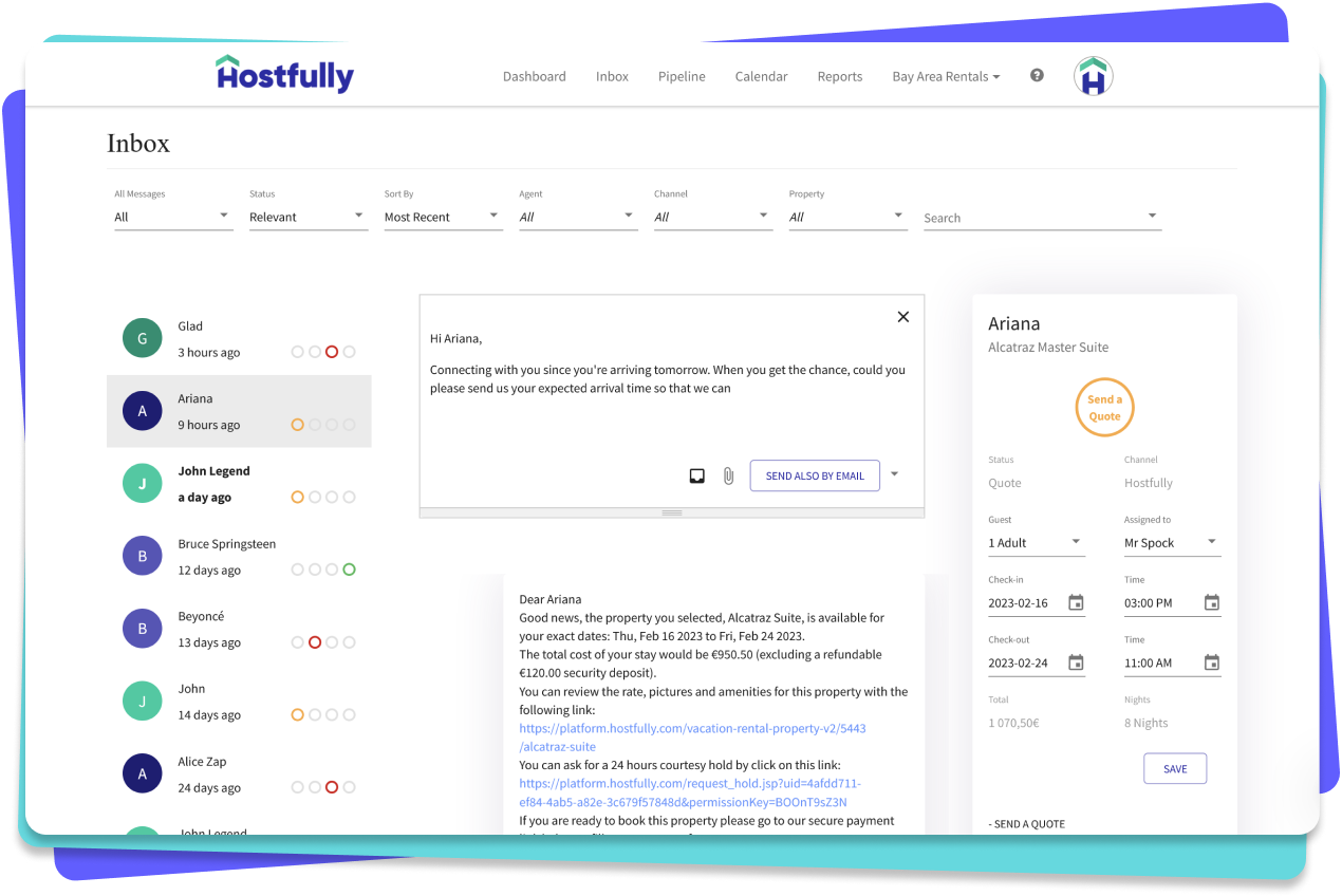 Mit der Buchungs-Pipeline von Hostfully erhalten Sie einen Überblick über alle Ihre Buchungen. Beschleunigen Sie Ihren Buchungs-Workflow: Senden Sie sofort Angebote, schließen Sie Leads ab, blockieren Sie die Unterkunft, fordern Sie Zahlungen an und stornieren Sie Buchungen mit nur wenigen Klicks.