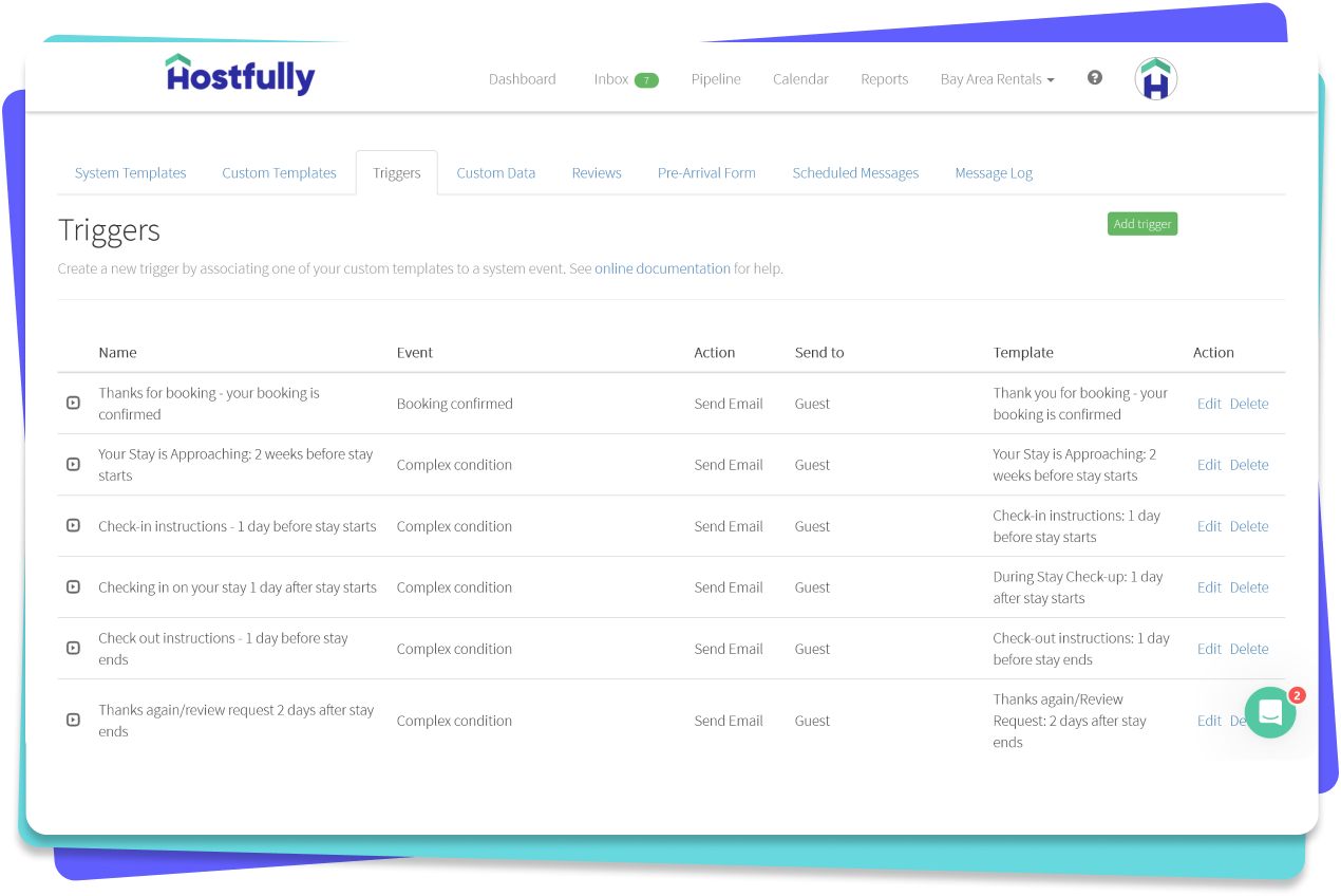 Speichern Sie Vorlagen für Gästebewertungen und erstellen Sie Auslöser mit unserer speziellen Funktion, Hostfully Airbnb Automated Reviews, um nach einem Aufenthalt automatisch 5-Sterne-Bewertungen zu veröffentlichen.