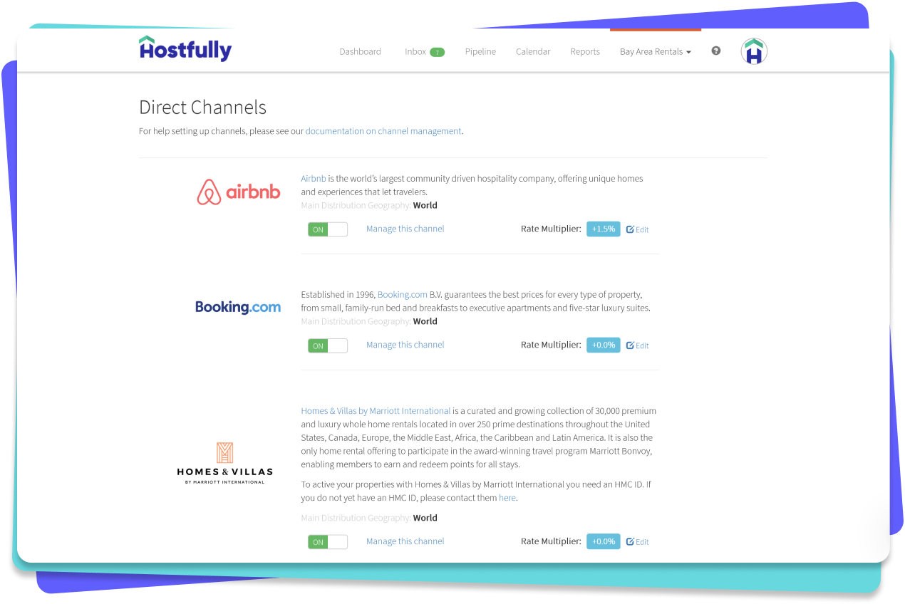Hostfully ermöglicht es Ihnen, Ihre Unterkünfte auf allen wichtigen Websites zu platzieren, auf denen Gäste suchen. Mit einem hervorragenden Channel Manager und direkter API-Integration sind wir ein bevorzugter Konnektivitätspartner von Airbnb, Vrbo und Booking.com.