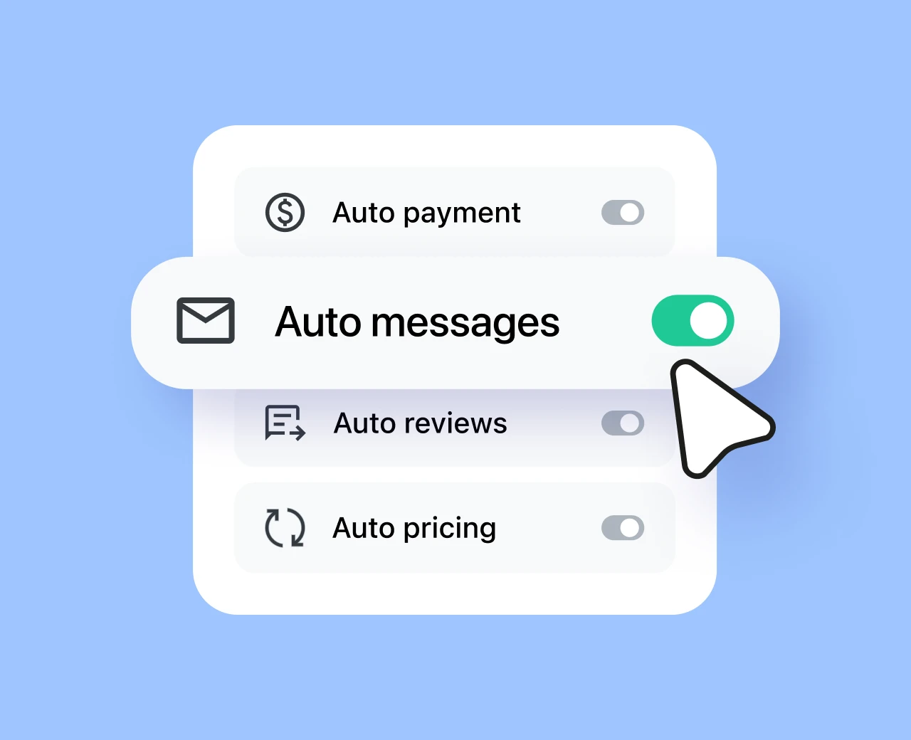 Das Automatisieren mühsamer und sich wiederholender operativer Aufgaben ist eine Möglichkeit, Zeit zu sparen, manuelle Fehler zu reduzieren und ein Burnout der Mitarbeiter zu verhindern. Die eingesparte Zeit führt direkt zu mehr Gewinn und Wachstum, und Ihr Team hat mehr Zeit, das Gästeerlebnis zu verbessern. Unsere Kunden bezeichnen unsere Automatisierungsfunktionen oft als einen ihrer Lieblingsaspekte unserer Ferienwohnungssoftware.
