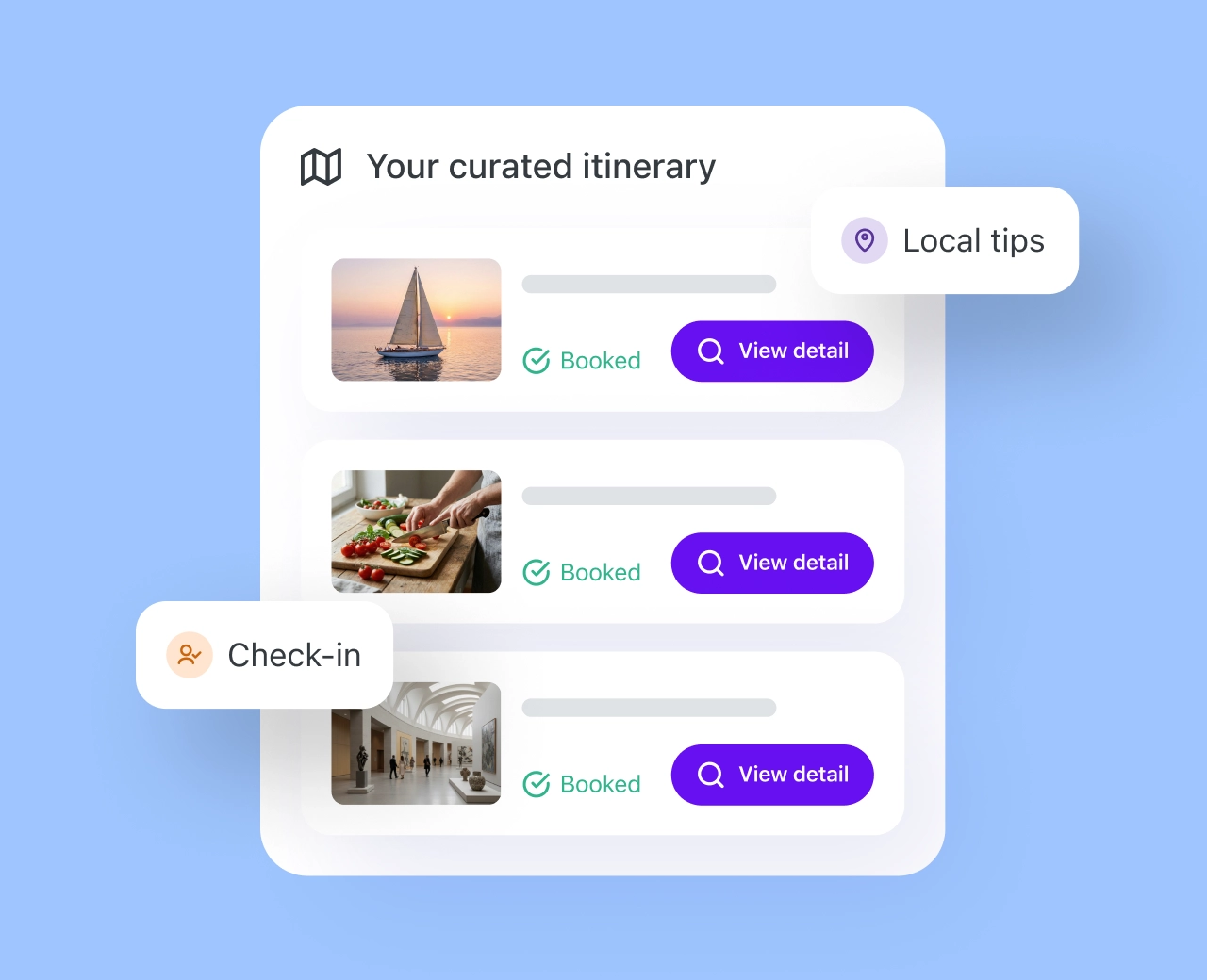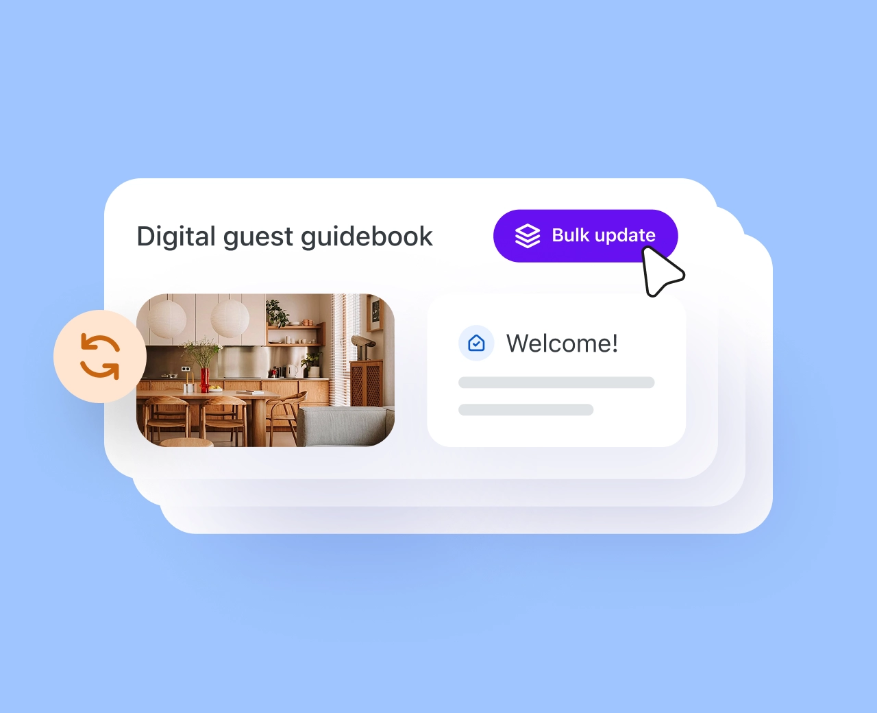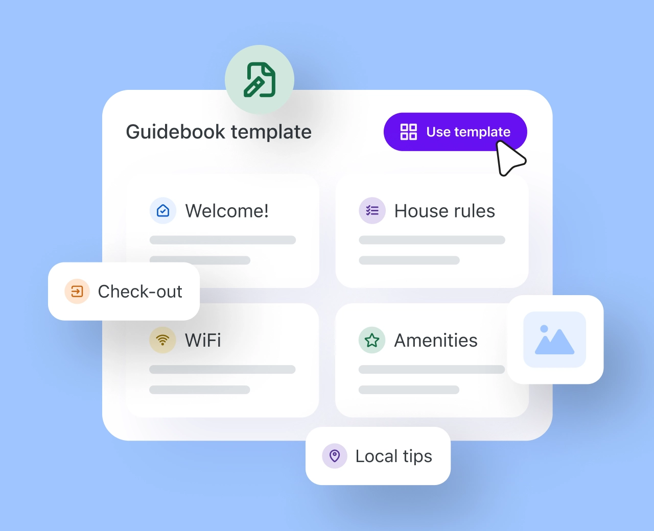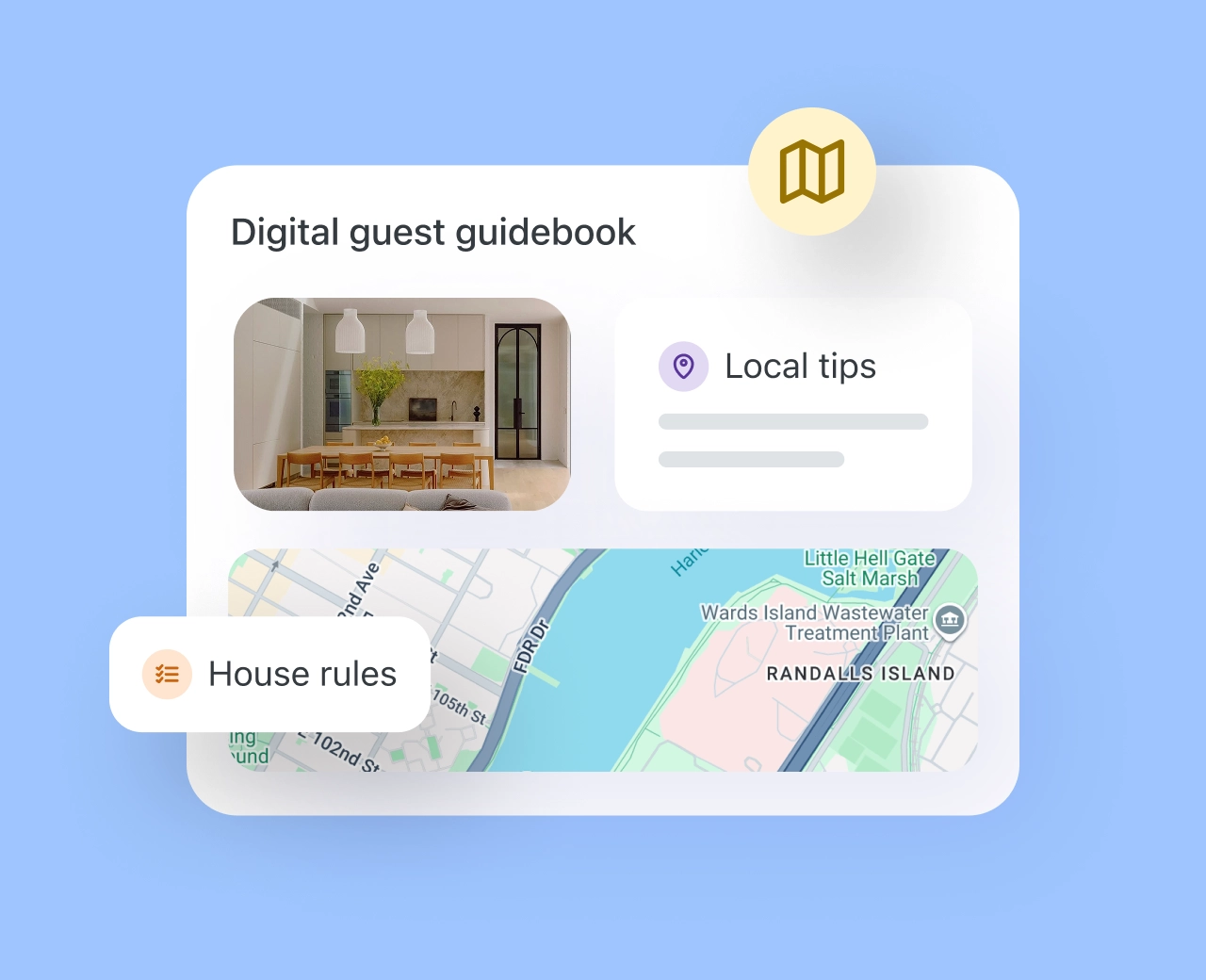 Crea guide di benvenuto personalizzate con dettagli sulla proprietà, video, mappe, consigli, itinerari generati dall'IA, servizi e componenti aggiuntivi per risparmiare tempo, stupire gli ospiti e aumentare i tuoi profitti.
