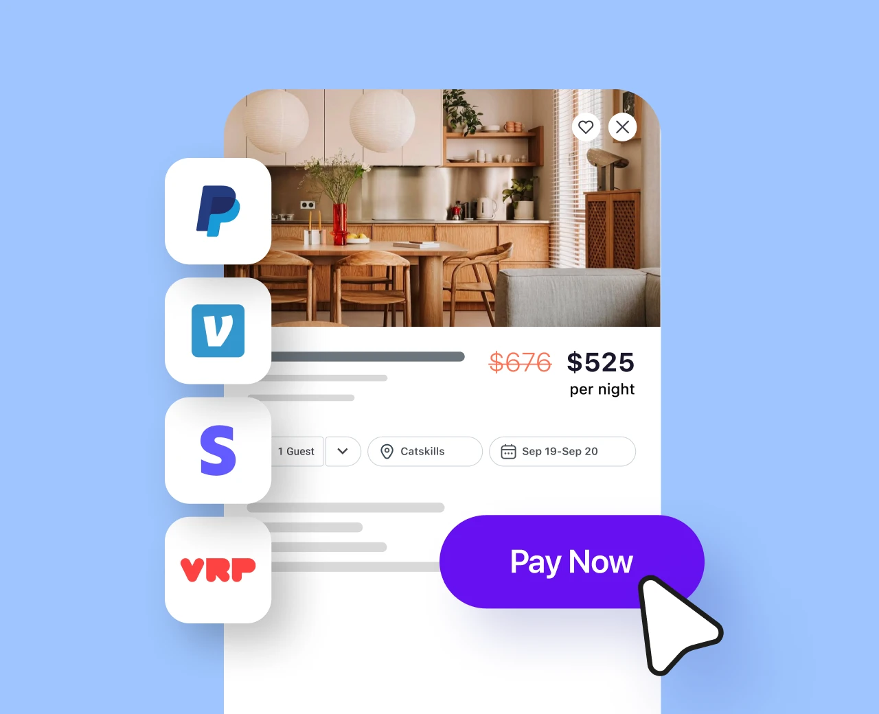 I pagamenti sono semplici grazie ai nostri partner integrati, tra cui PayPal, Vacation Rent Payment e Stripe, e anche tramite bonifici bancari, Venmo e altro.