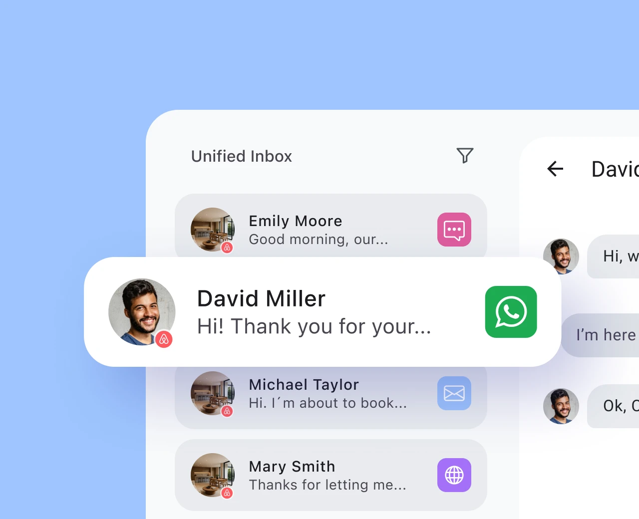 Send and receive SMS, WhatsApp, email, and multi-channel OTA messages—without logging in and out of different OTAs.