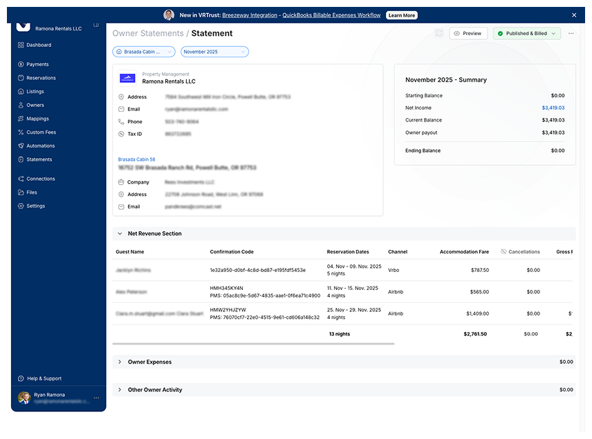 He also can view and export individual owner statements, and then send directly to owners through Hostfully.